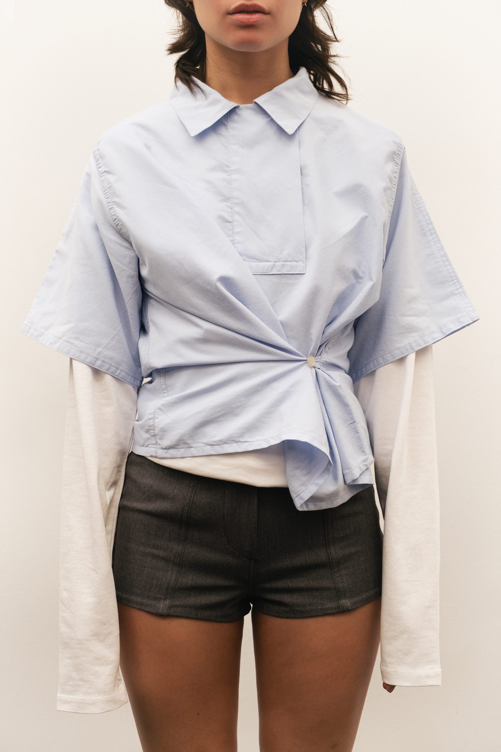 Polo de manga corta con botón para ajustar a la cintura, creado con patronaje zero waste.