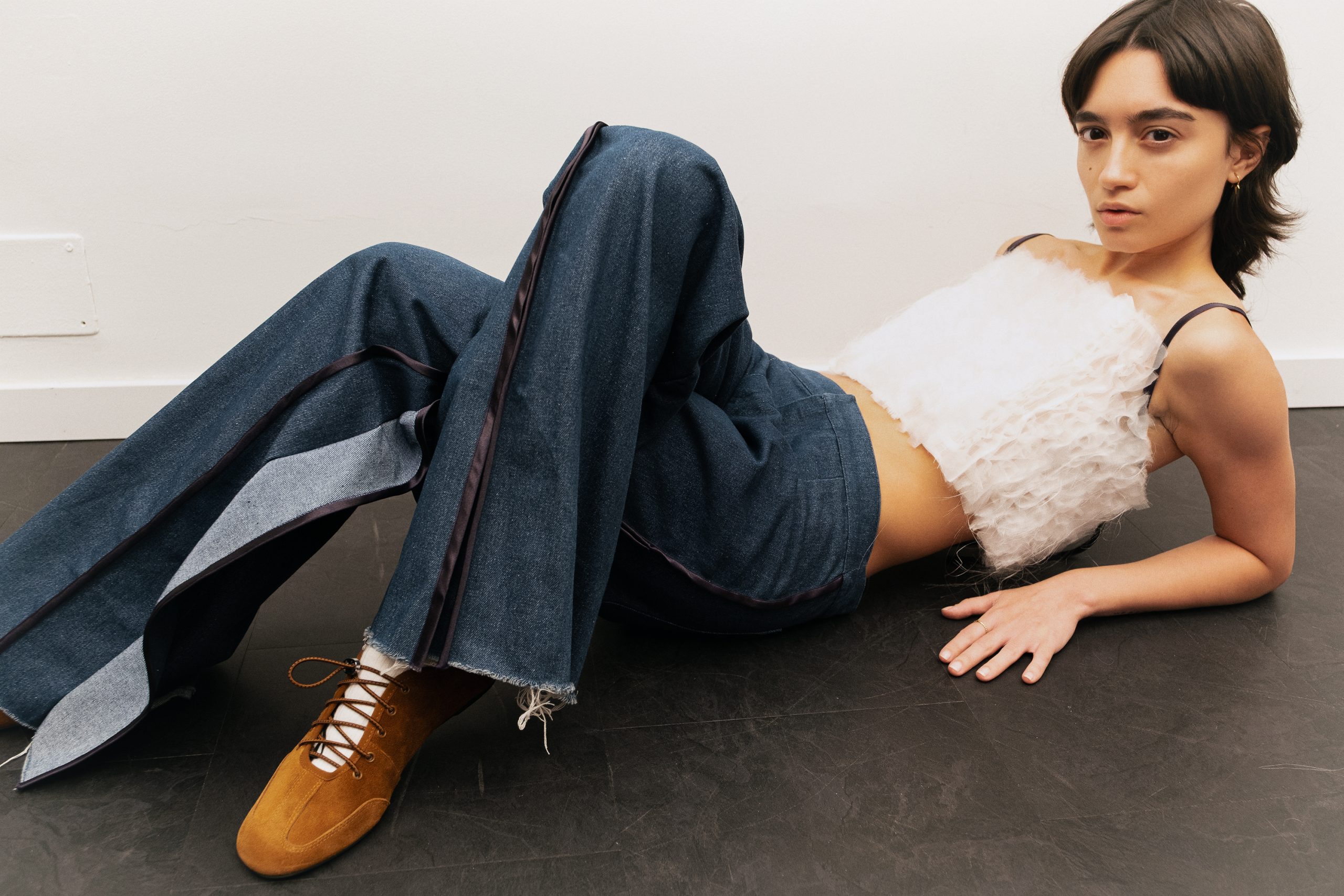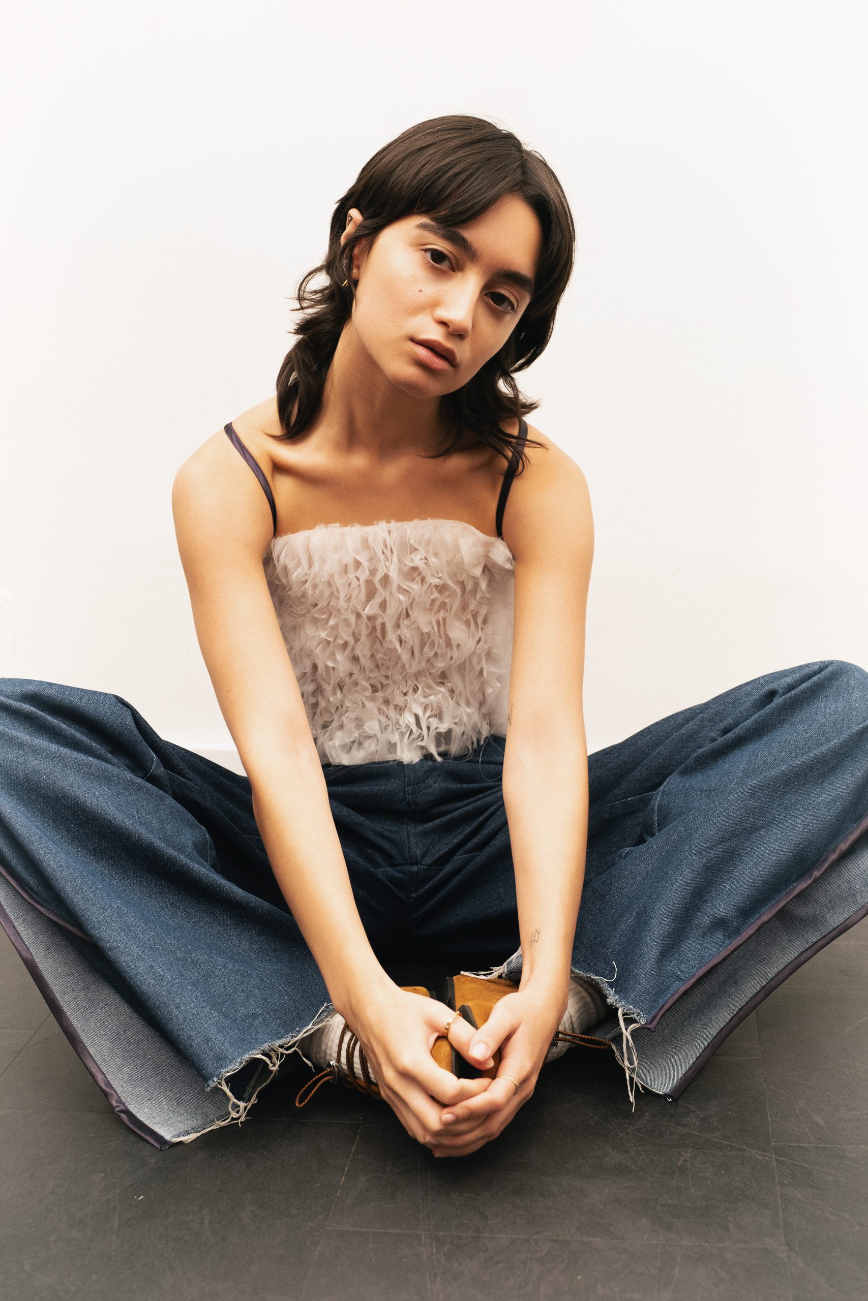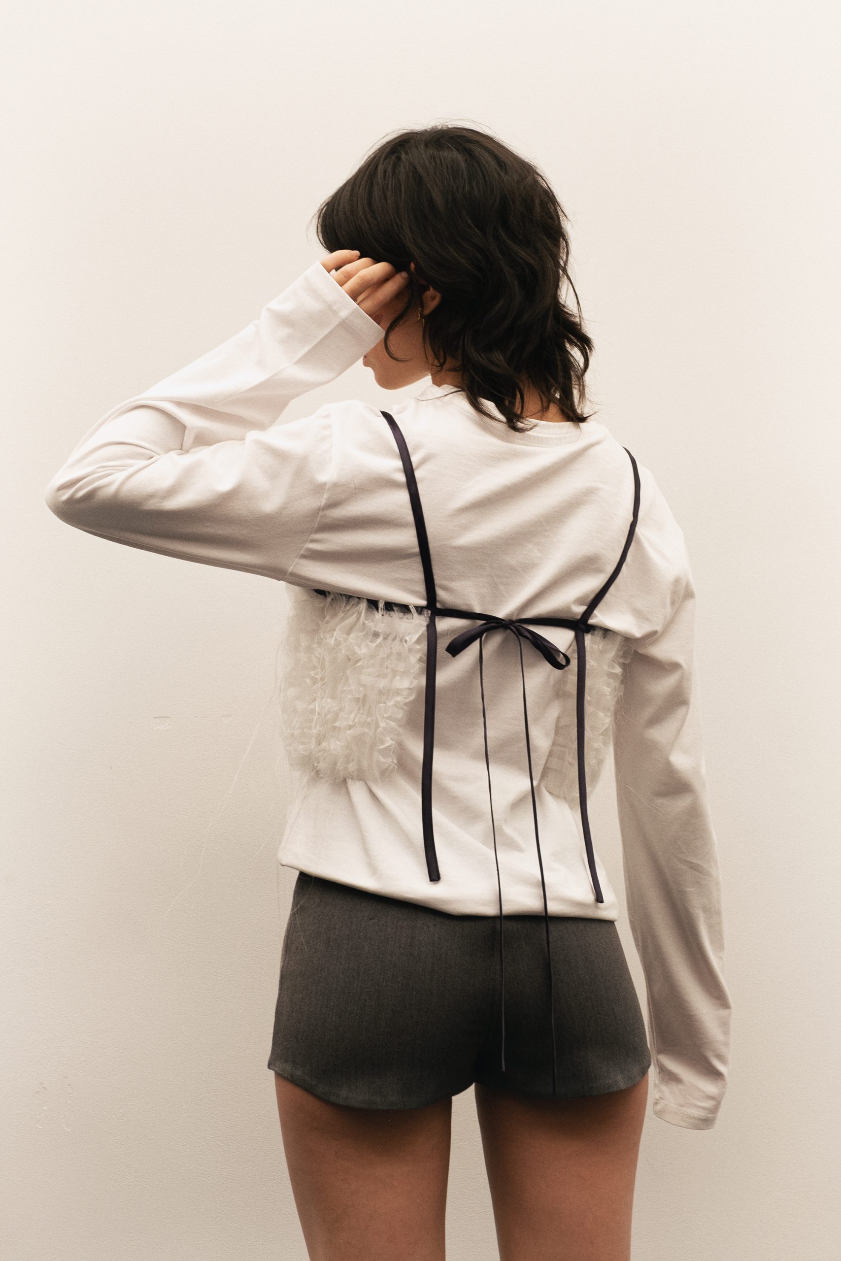 Top de tirantes hecho de retales de organza, cerrado con lazada en la espalda.